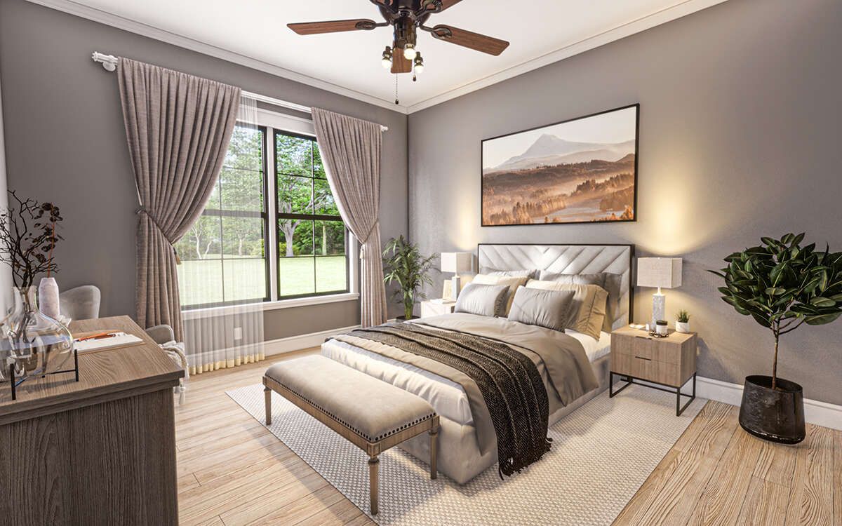 The two secondary bedrooms share a hall bathroom, and their placement away from the master helps reduce noise and improve privacy.