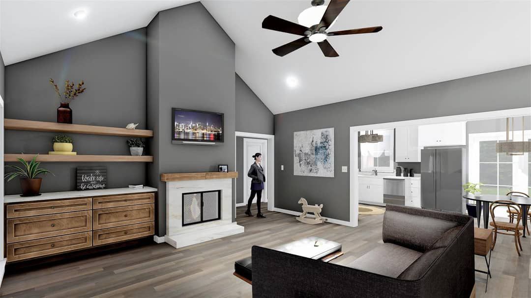 The great room with vaulted ceiling serves as the main gathering space, anchored by the fireplace. It’s visually open toward the dining/kitchen area.