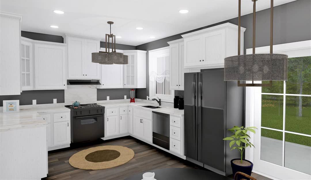 Kitchen features include a thoughtfully placed layout adjacent to dining and great room, with strong connection to the outdoors via the sliding glass doors.