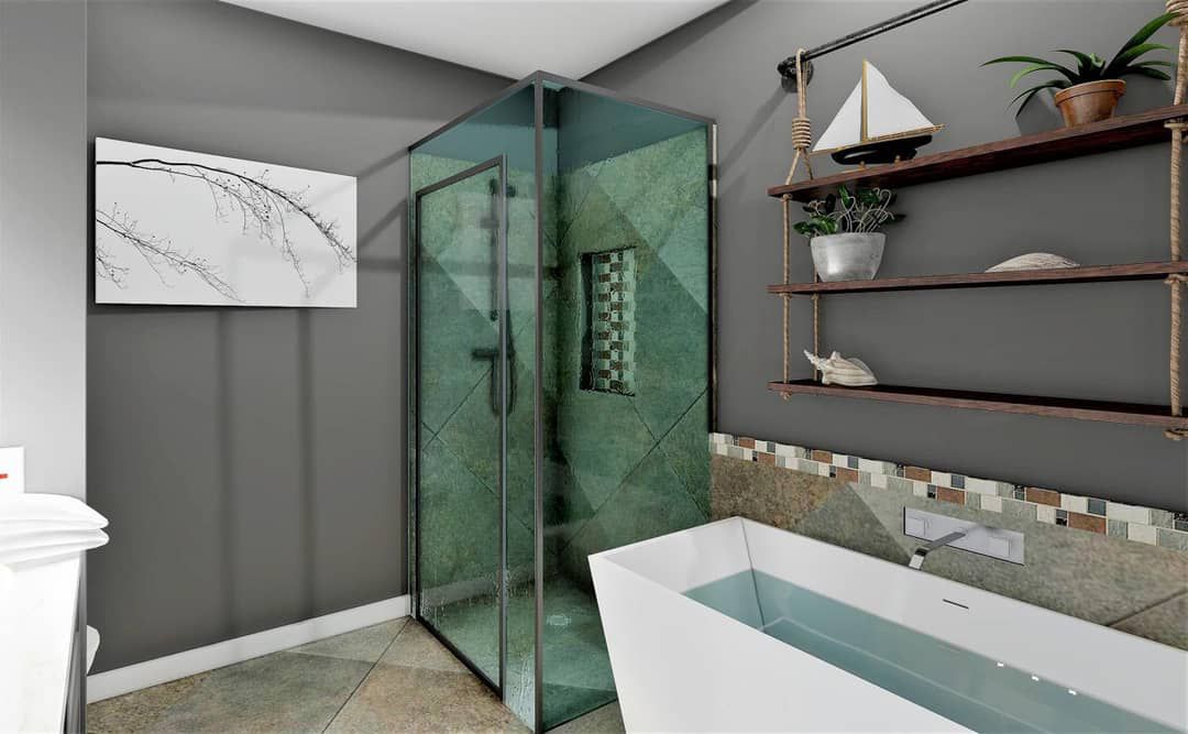 The master suite is located on one side of the house for privacy. It comes with a walk-in closet, a full bathroom featuring both a walk-in shower and a freestanding tub.