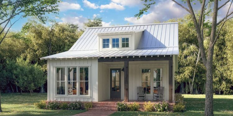 This rustic country cottage presents **1,299 square feet** of heated space, built in a single story. The exterior features board-and-batten siding with a metal roof, lending durability and country character.
