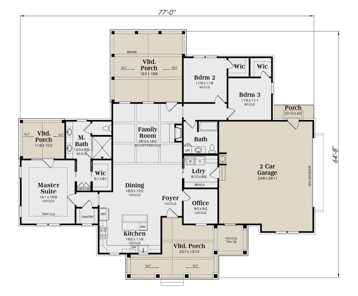 The frontage is generous: about **77 ft wide by 64 ft-8 in deep**. A large front porch (~326 sq ft), side porch (~119 sq ft), and back porch (~350 sq ft) give excellent options for outdoor living.