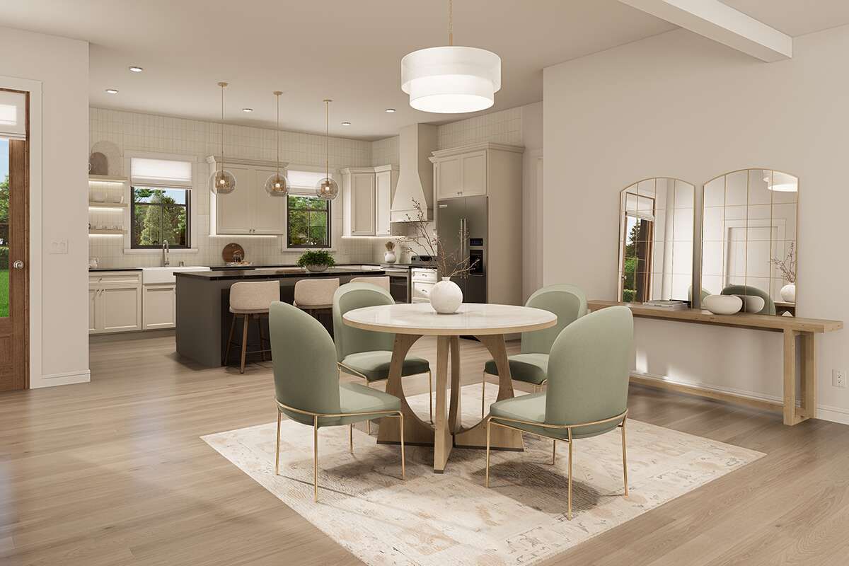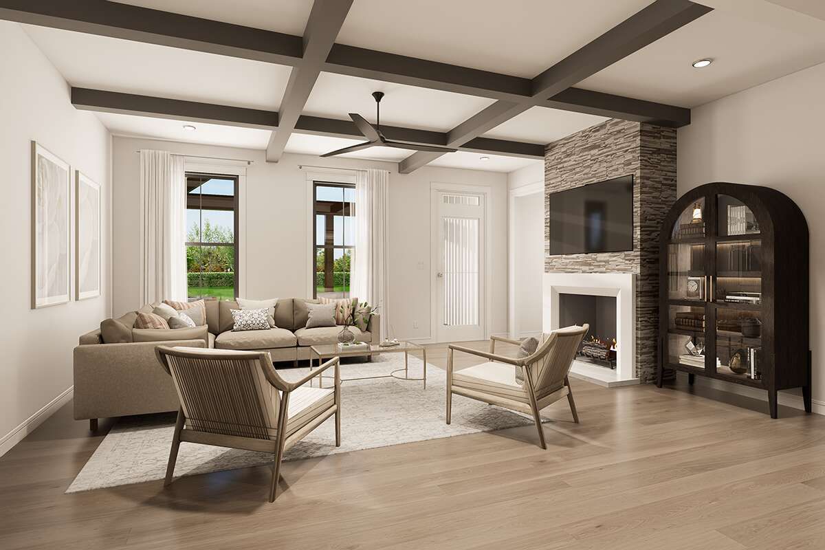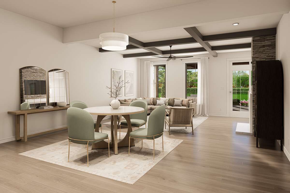The great room / living space is central and open, connecting directly with the dining area and kitchen. Large windows and porch access likely let in lots of daylight.