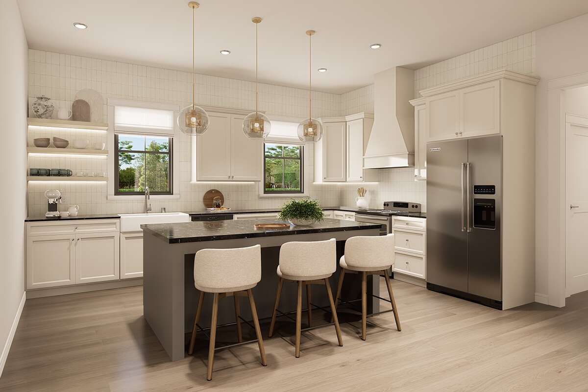 The kitchen includes an island and likely well-proportioned cabinetry and workspace. It is positioned to facilitate views to both indoor living and outdoor spaces (porches) for a cohesive flow.