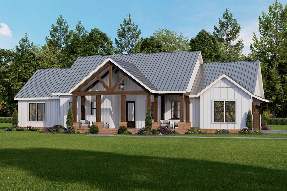 This is a **single-story modern farmhouse** with about **1,916 square feet** of heated living space. Framed with 2×4 wood (with paid option for 2×6), it combines traditional farmhouse warmth with clean, modern lines.