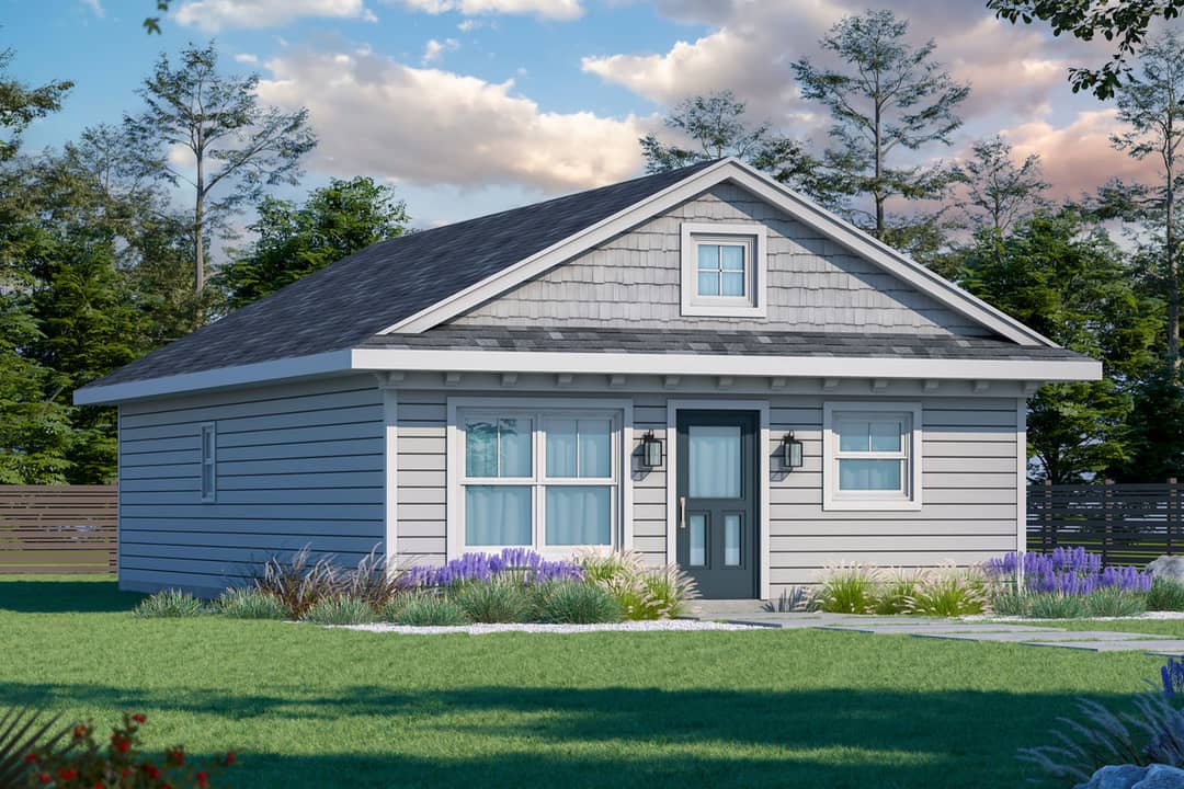 The front façade is open from wall to wall: wide windows or possibly sliding doors (depending on finishing choices) may be used, and trim likely follows cottage / country / traditional styling. Though details like siding materials aren’t elaborated heavily, expect simple clean lines to match the compact character.