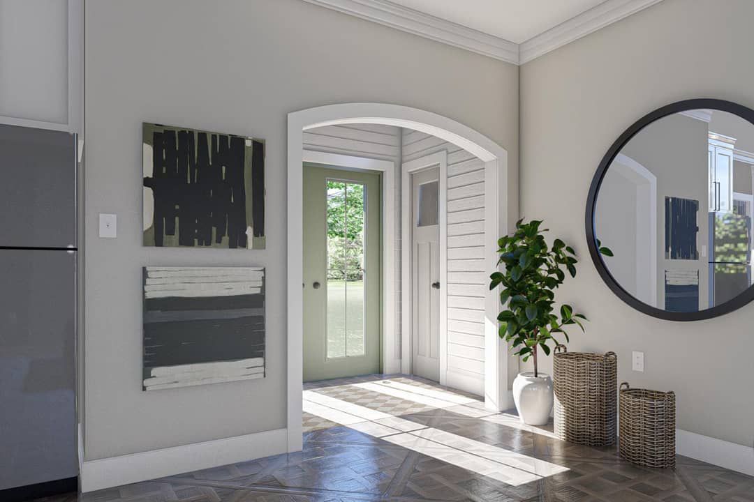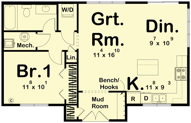 Storage is handled with the mudroom bench area, likely a closet in the bedroom, and kitchen cabinetry. The efficient layout keeps storage integrated.