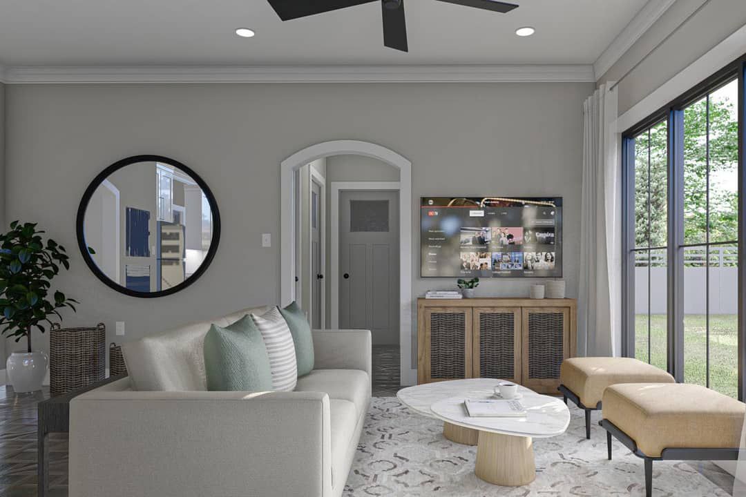 A nearby pantry or storage area is implied to support functional daily use without cluttering the living zones.