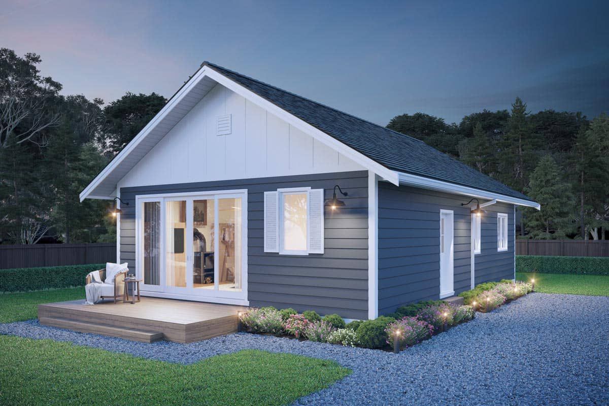 The façade likely features board & batten or horizontal lap siding, cross-gables or shed roof elements, and reserved trim detail to lower construction cost.