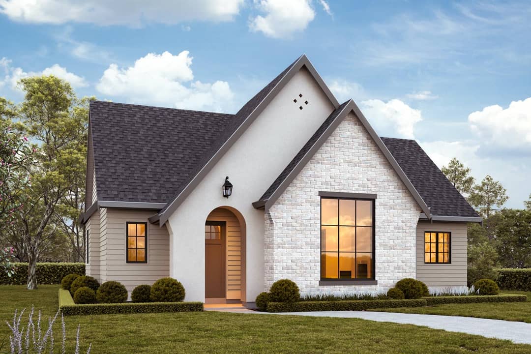 The style leans European-Contemporary: steep gables, arched entry details, and a strong vertical emphasis.