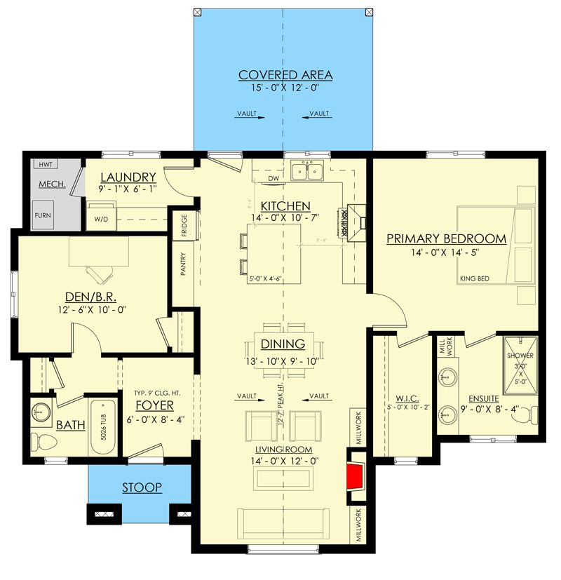 The heart of the home is the **vaulted great room** (living/dining/kitchen), which soars overhead and unifies the central spaces.