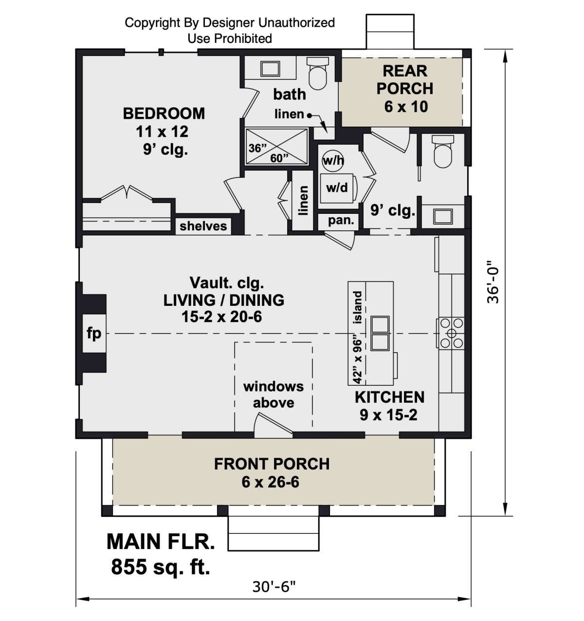 The footprint spans **30 ft 6 in × 36 ft**, with a maximum roof ridge height of **24 ft** in the peaked roof zones.