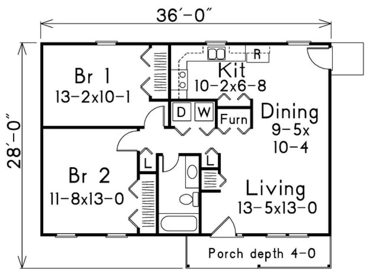 The footprint is **36 ft wide × 28 ft deep**, making it suitable for narrower lots.