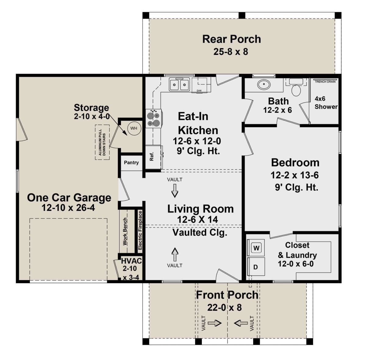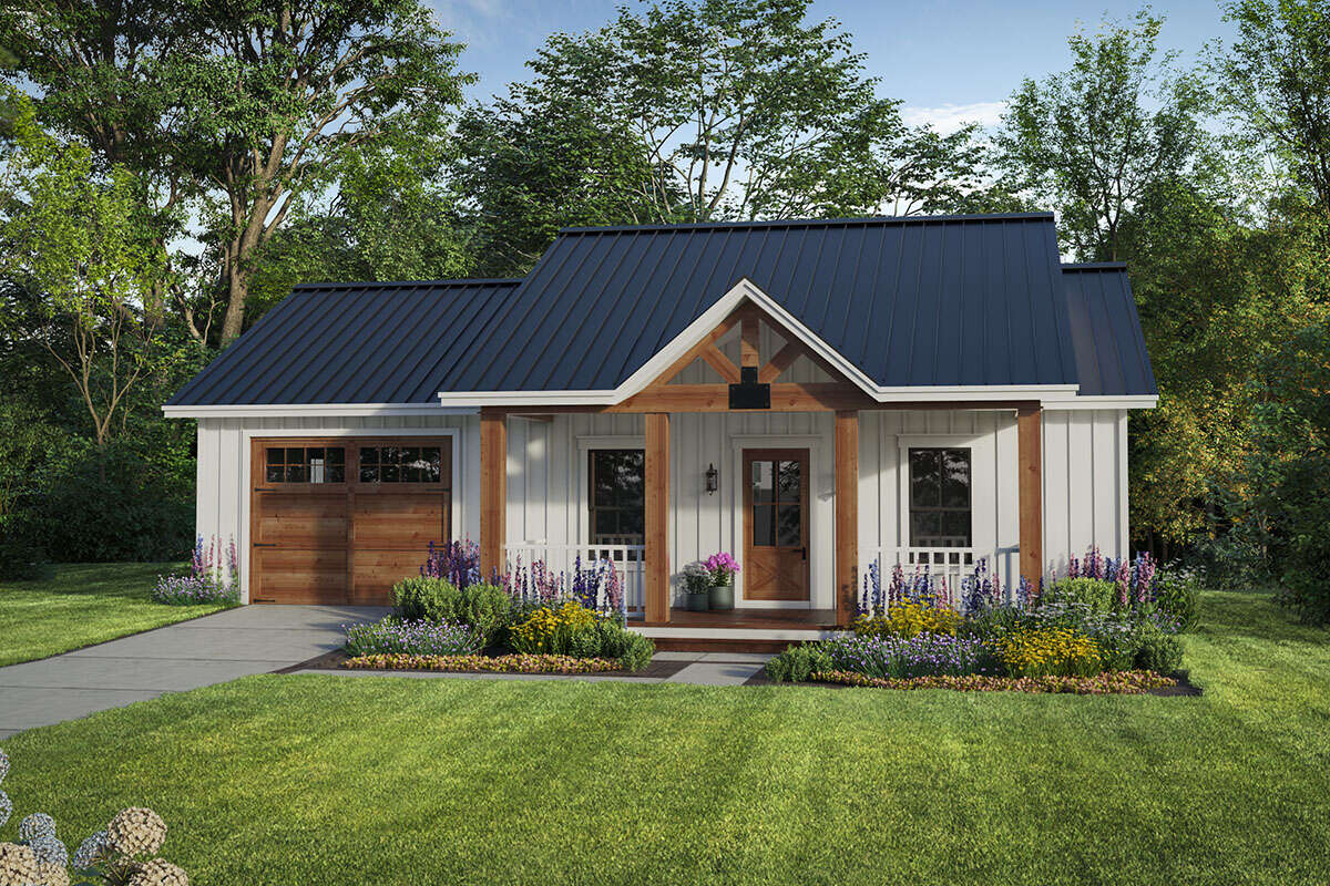Plan 348-00332 is a refined example of small-scale modern farmhouse living. With its open layout, generous porches, integrated garage, and efficient one-bedroom design, it offers a stylish, compact home that doesn’t sacrifice functionality. Perfect as a primary home, guest cottage, or downsized living solution.