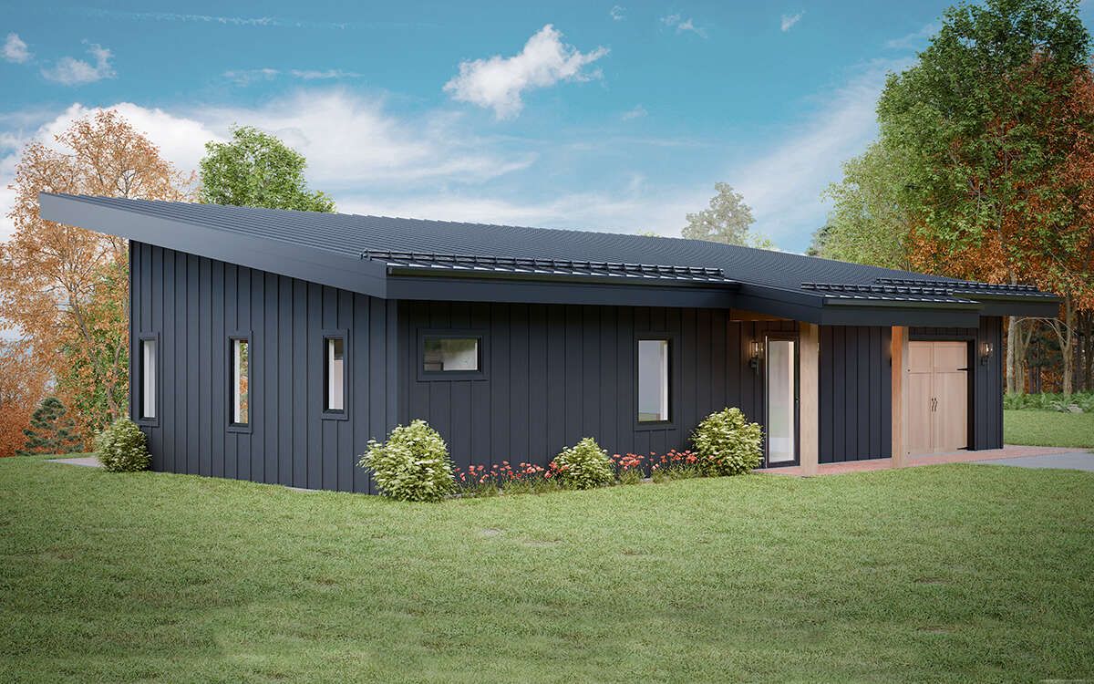 The roof uses a low **2:12 main pitch**, contributing to a clean modern silhouette. 3 Exterior walls are framed with **2×6 wood construction** by default.