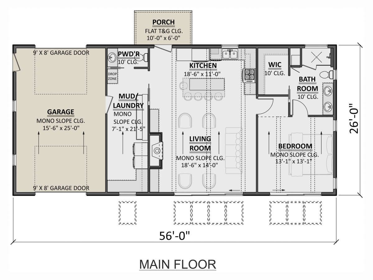 The footprint measures **56 ft wide × 32 ft deep**, giving a broad, shallow layout. 1 The maximum height of the roof ridge is **17 ft-1 in**.