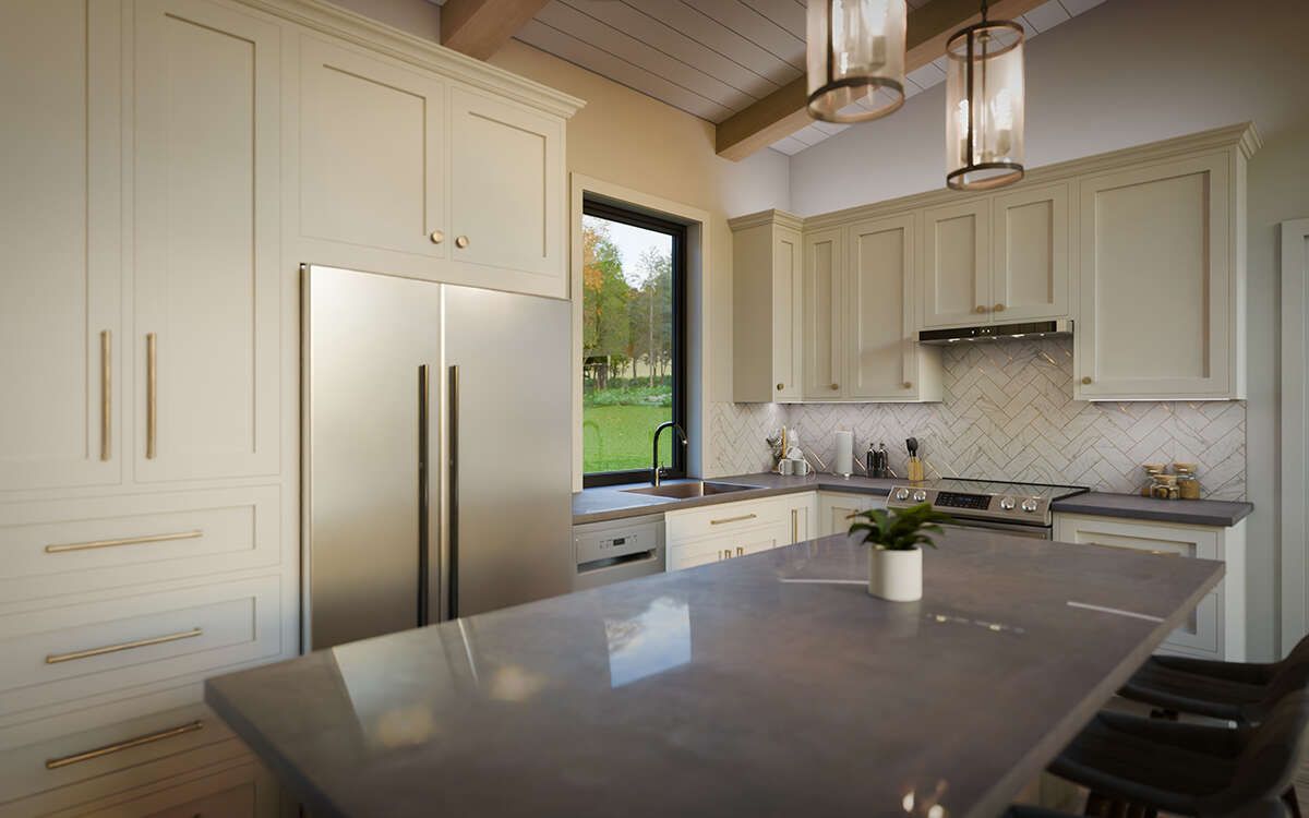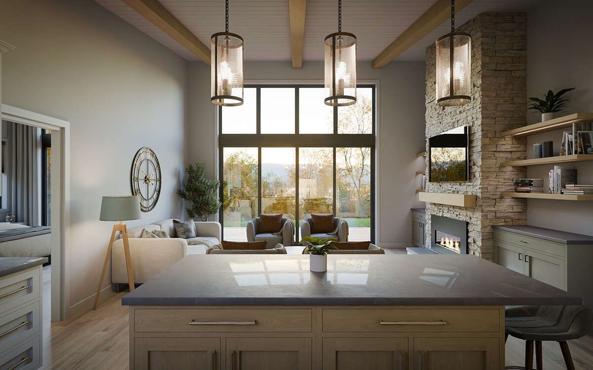 The kitchen includes an **island**, useful for meal prep and casual seating.