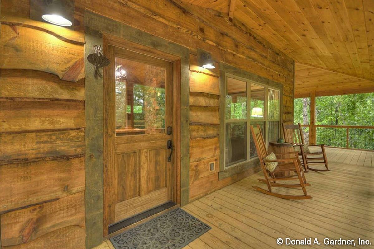 A **wrap-around porch** is included, giving generous outdoor sheltered space relative to the cabin’s size.