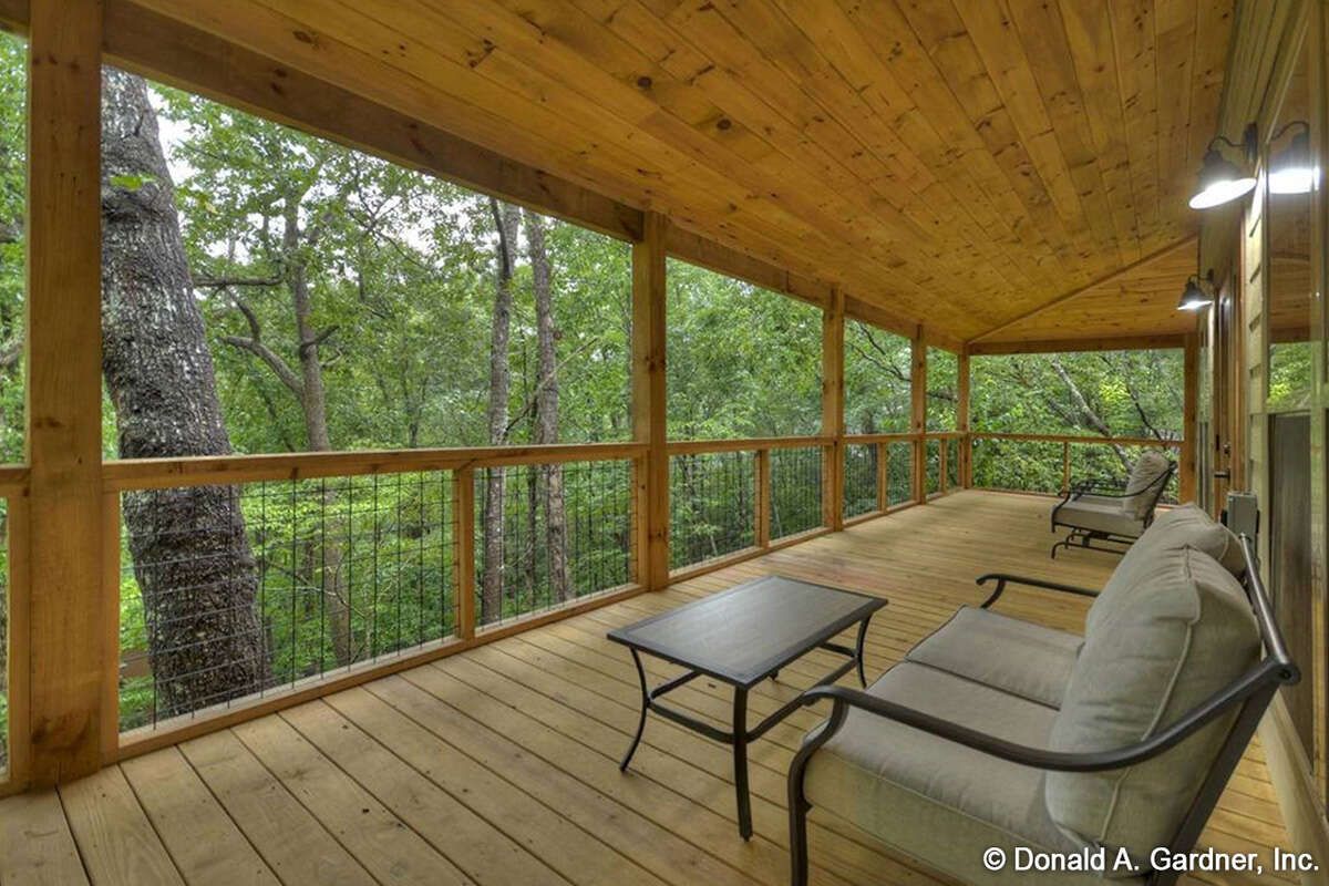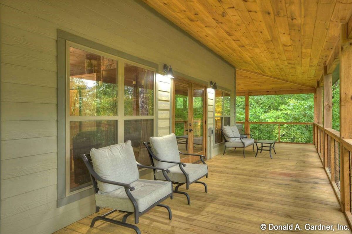 With the wrap-around porch wrapping part of the living zone, visual and physical connections to outdoor space are enhanced.
