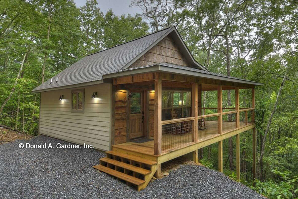 A **wrap-around porch** is included, giving generous outdoor sheltered space relative to the cabin’s size.