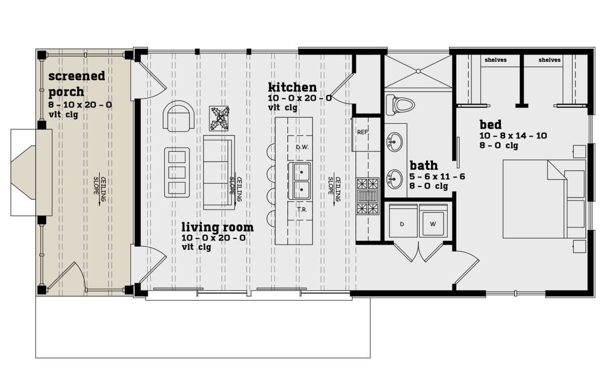 This cabin plan proves that small can still feel complete. With its open interior, single bedroom, full bath, and a welcoming porch, it delivers the essentials in a package that’s cozy yet functional. Perfect as a primary cabin, guest retreat, or downsized living home with character.