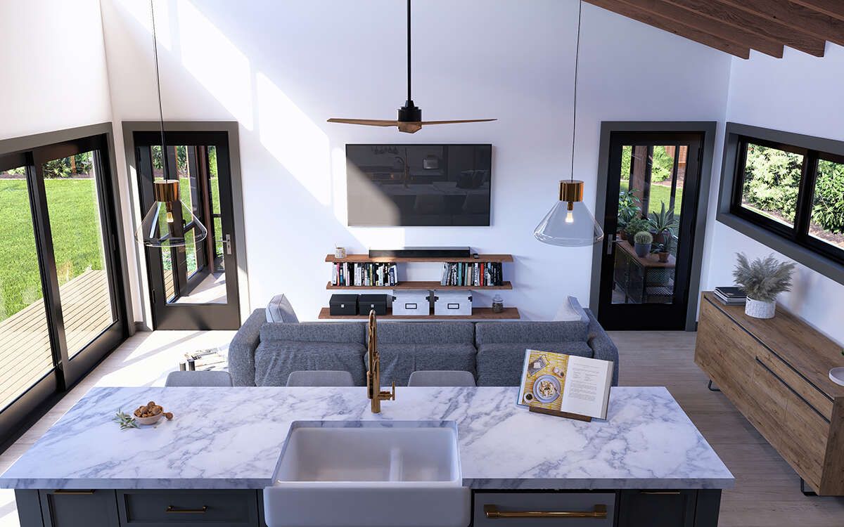 You step into an open core: living, dining, and kitchen are contiguous with minimal partitions to preserve flow.