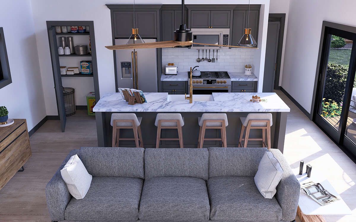 The “kitchen island” is part of the open space, helping define the cooking zone without closing off the layout.