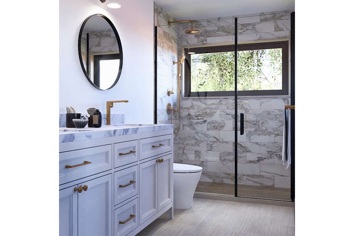The bathroom is situated to serve both residents and guests without disrupting privacy too much.