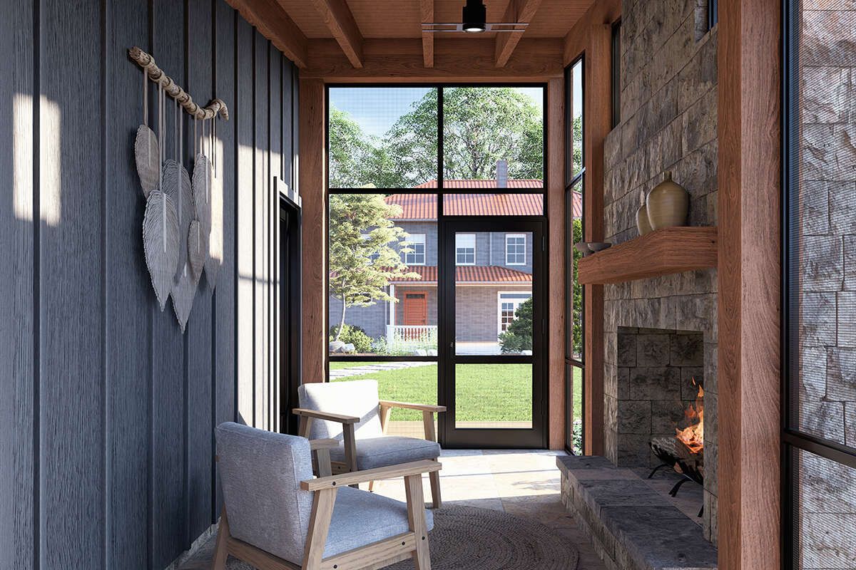 The front porch extends the usable living area outdoors, ideal for the cabin’s scale.