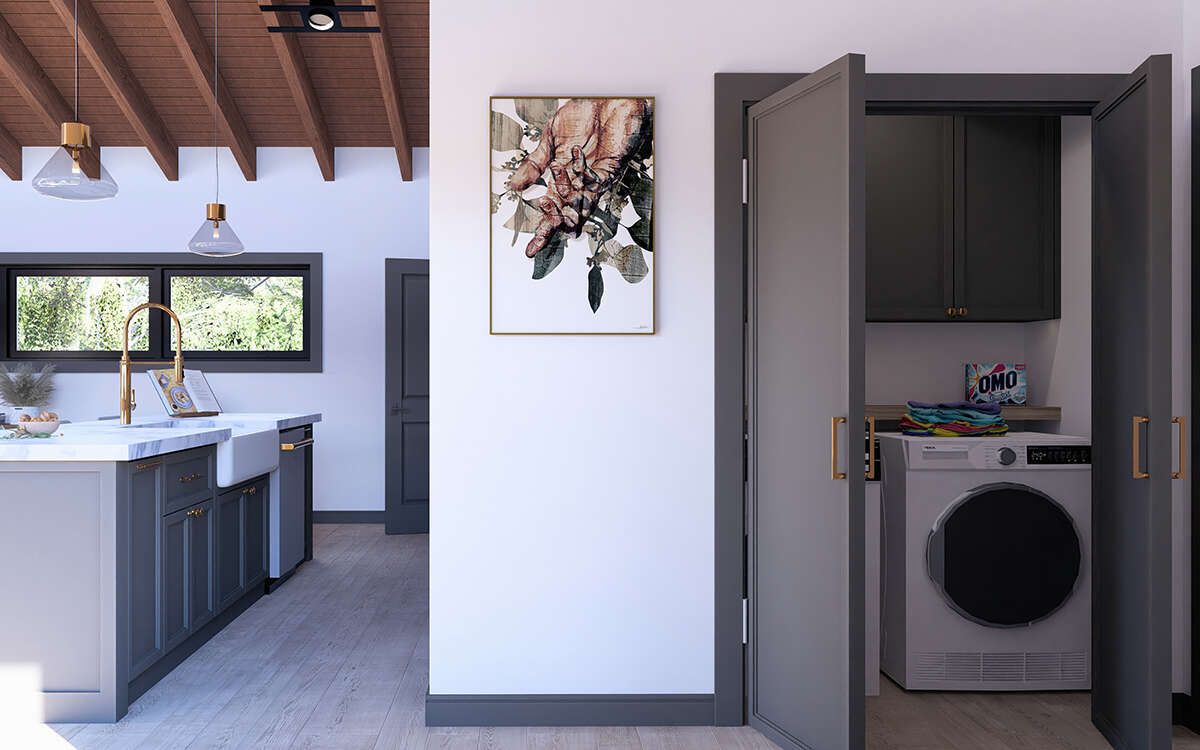 The living area flows into the dining and kitchen zones, giving an open, multipurpose core.