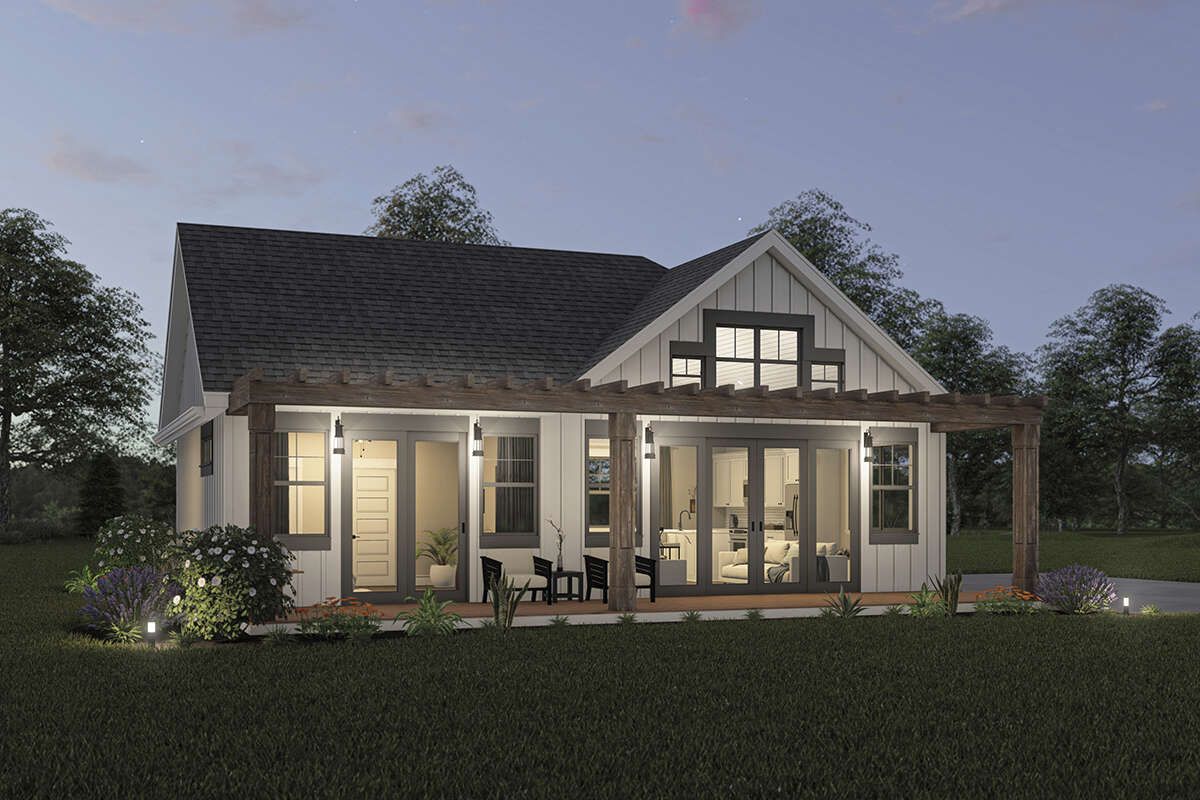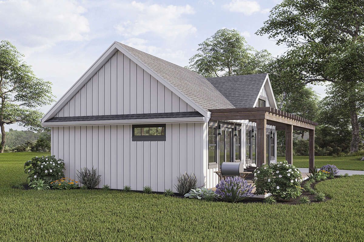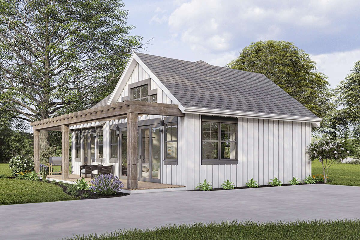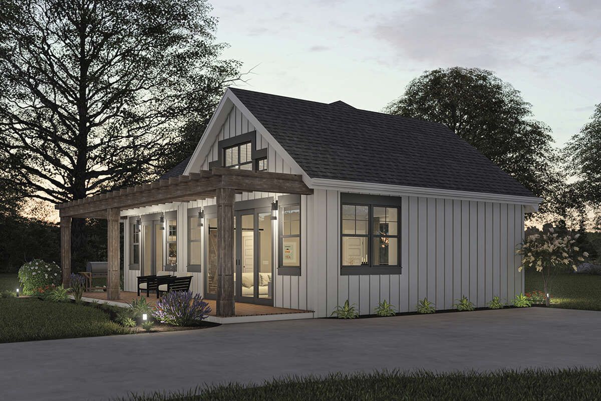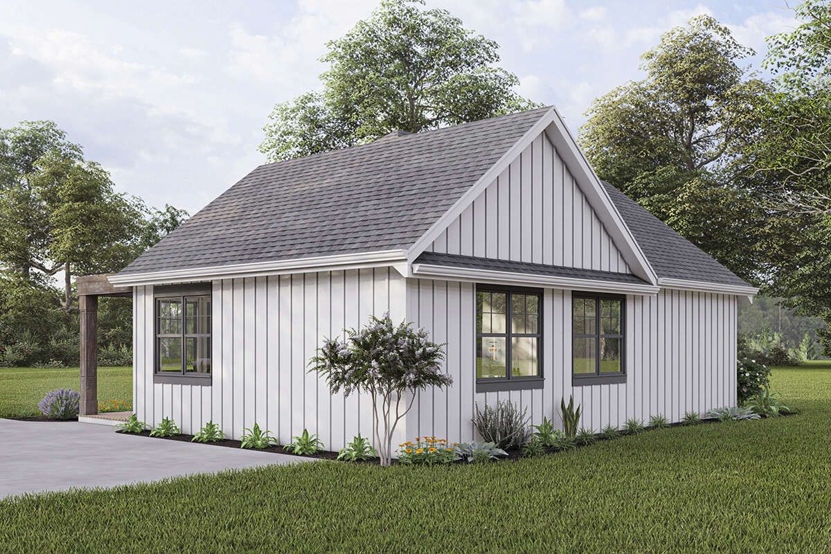 Plan 1462-00034 offers a well-balanced modern farmhouse in under 1,000 sq ft. The single bedroom plus 1½ baths provide practical comfort, while the open core ensures the small footprint feels airy. The bold roof pitch and efficient layout make it a compelling choice for someone who wants style without excess.