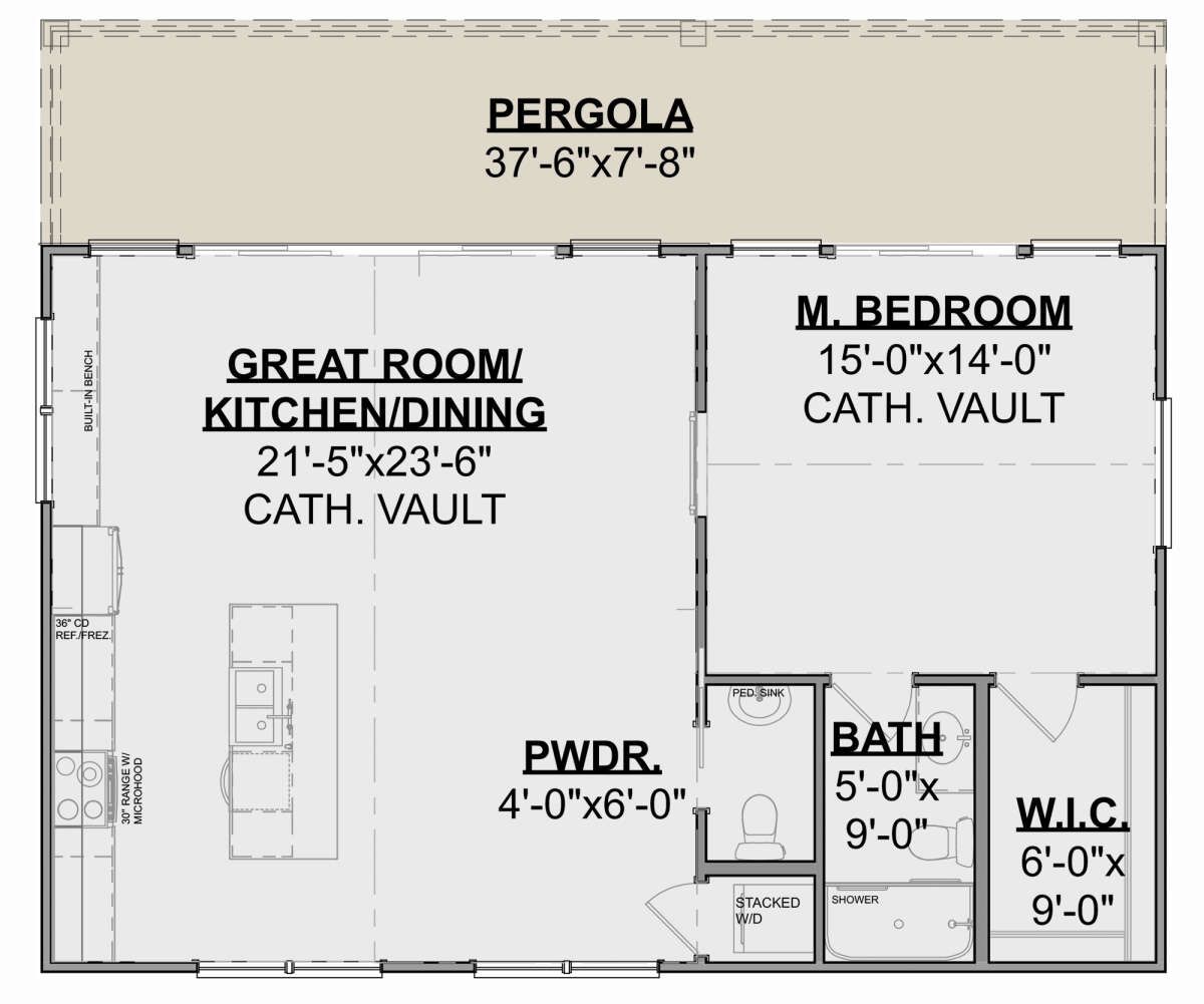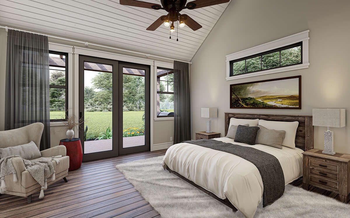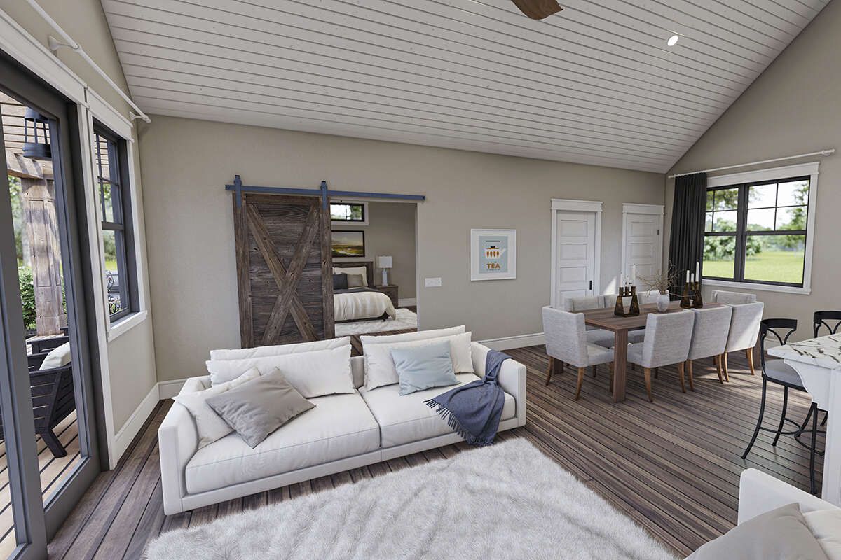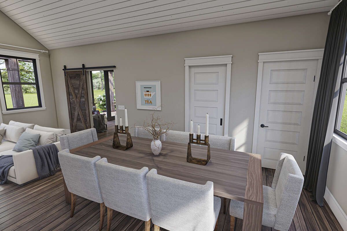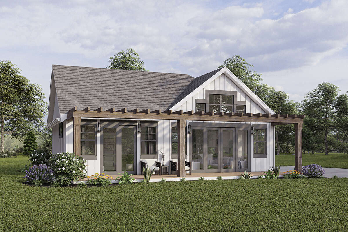 Plan 1462-00034 offers a well-balanced modern farmhouse in under 1,000 sq ft. The single bedroom plus 1½ baths provide practical comfort, while the open core ensures the small footprint feels airy. The bold roof pitch and efficient layout make it a compelling choice for someone who wants style without excess.