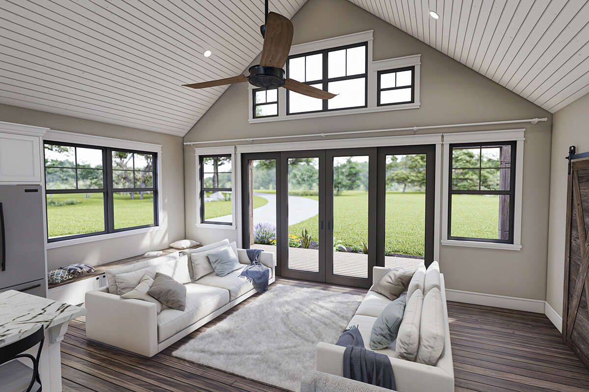 Windows and the connection to the porch help brighten the interior and create a sense of extension beyond the walls.