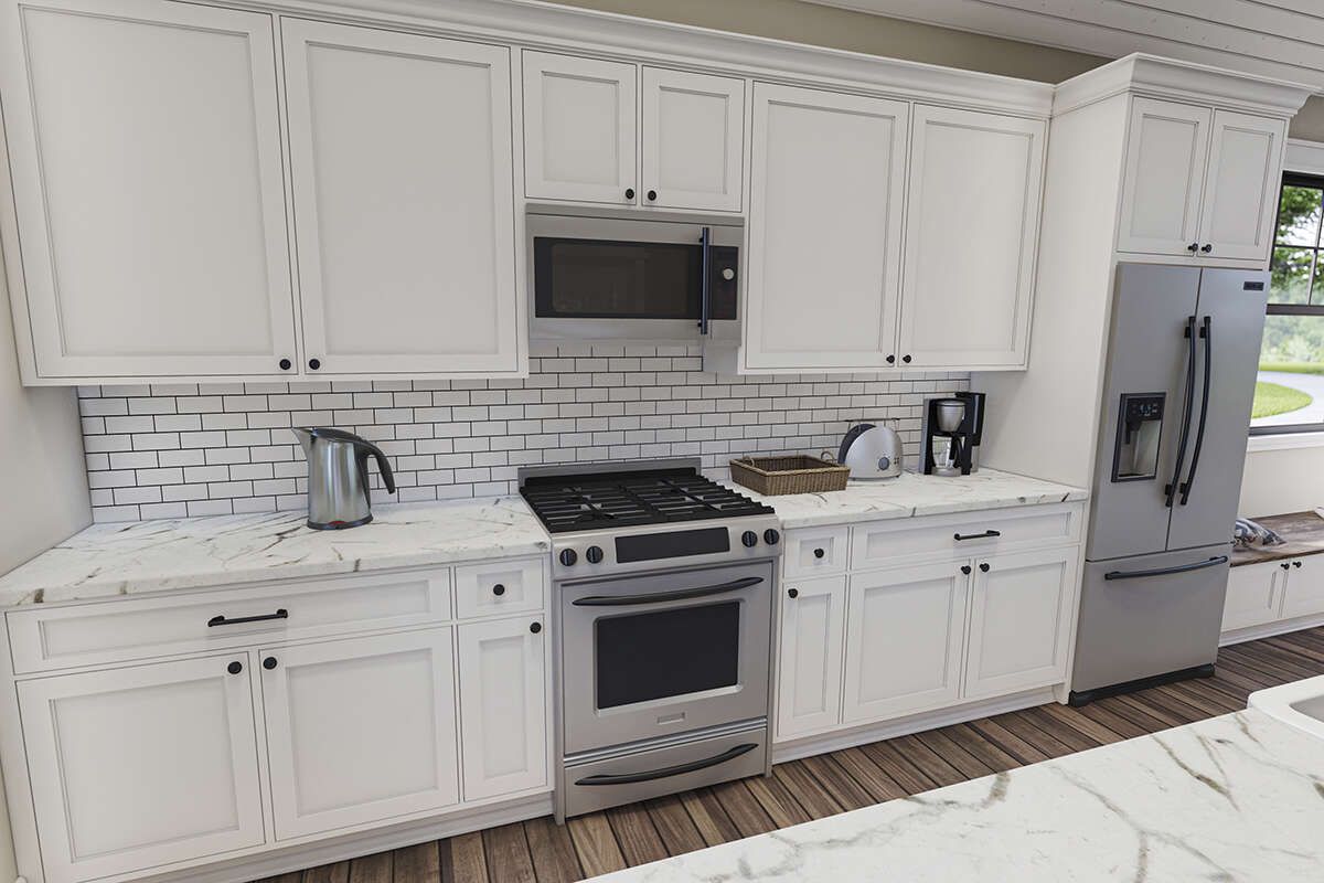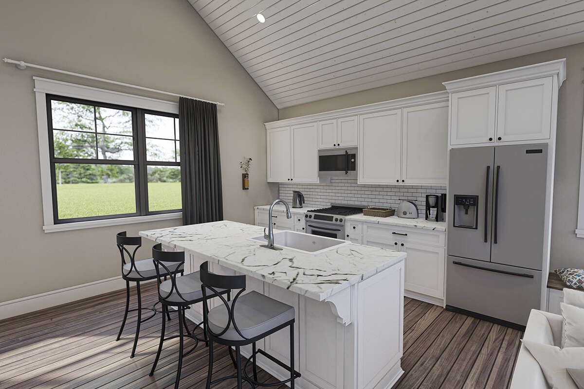 An island is incorporated into the layout, providing extra prep surface and casual seating.