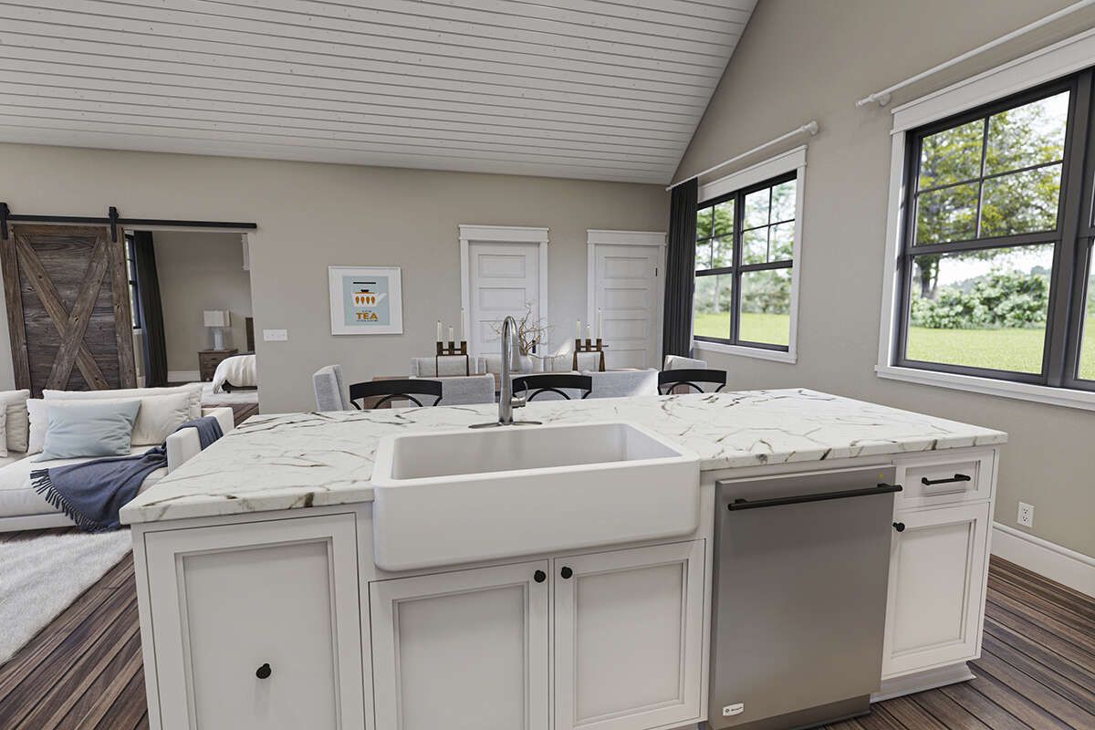The kitchen shares the open core, allowing the cook to remain engaged with other parts of the home.