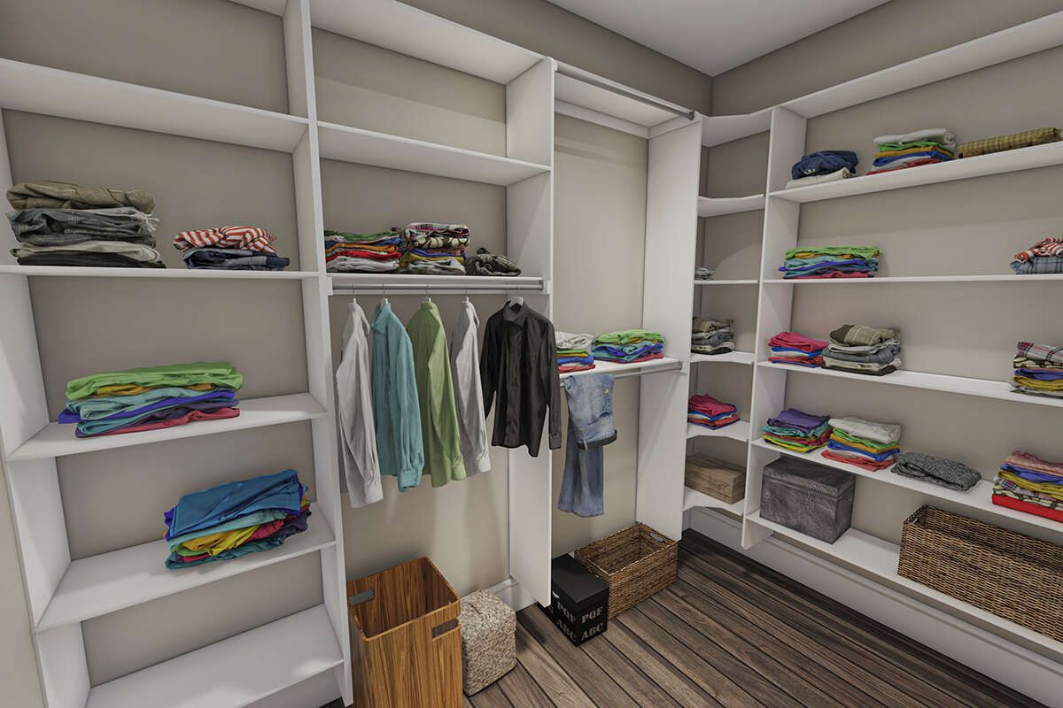 Storage is achieved via bedroom closets, kitchen cabinetry, and built-in solutions in the bathroom and common zones.
