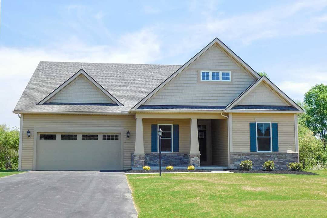 The exterior styling blends **shake and clapboard siding**, framed by a **covered front entry with columns**, all hallmarks of classic Craftsman charm.