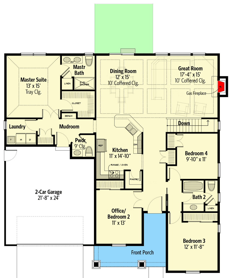 A **private office** is positioned at the front of the house, offering a quiet, tucked-away workspace (or optional fourth bedroom).