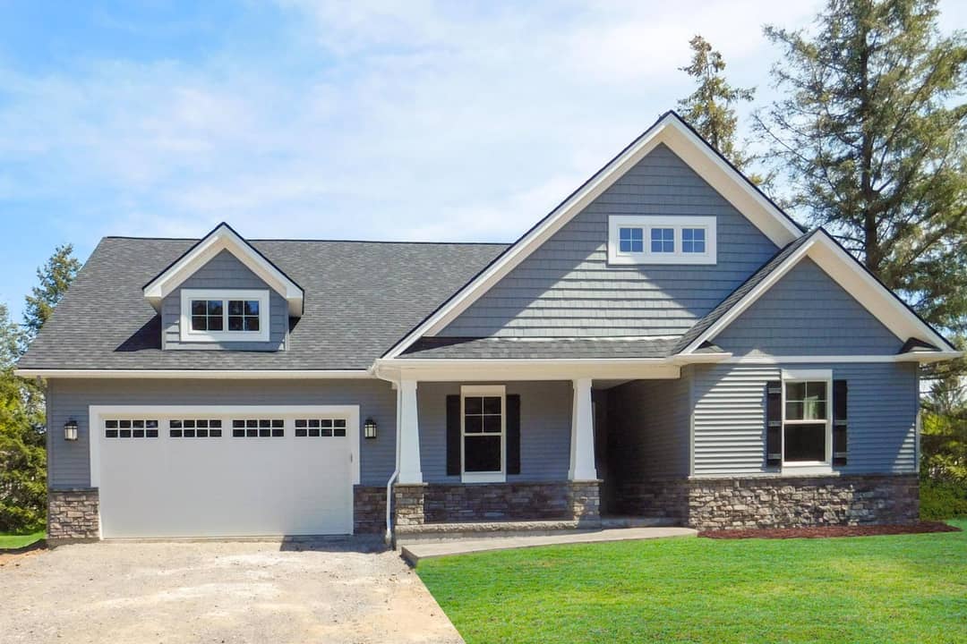 The exterior styling blends **shake and clapboard siding**, framed by a **covered front entry with columns**, all hallmarks of classic Craftsman charm.