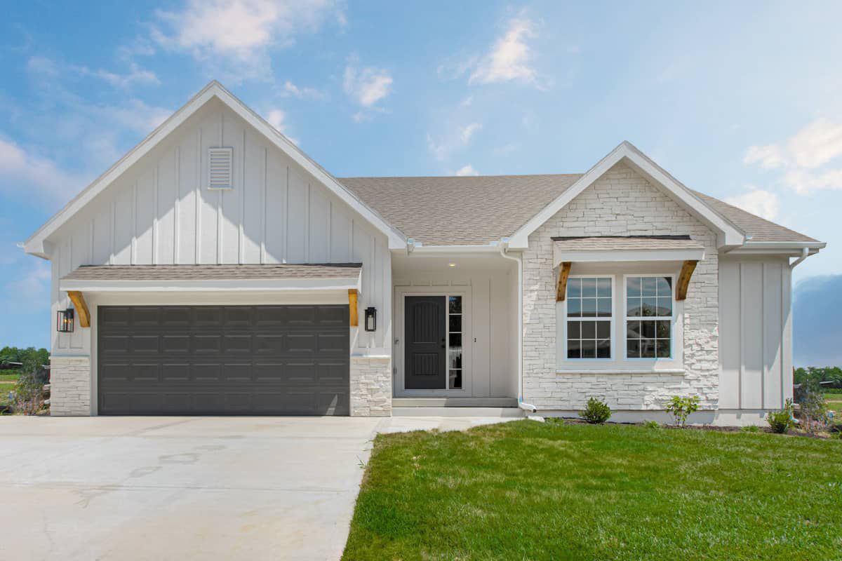This modern farmhouse is beautifully clad in **board-and-batten siding**, with stone accents and metal roof elements for a fresh, updated aesthetic.