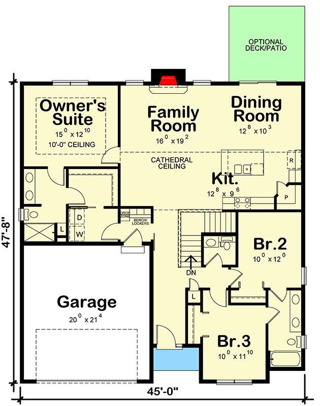 The home measures **45 ft wide × 47 ft 8 in deep**, with a maximum ridge height near **25 ft**.