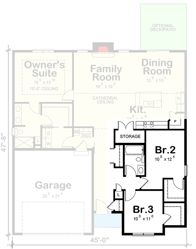 Upon entry, two of the bedrooms lie to the right of the entry hall; straight ahead is the great room, kitchen, and dining zone, fully open to each other.