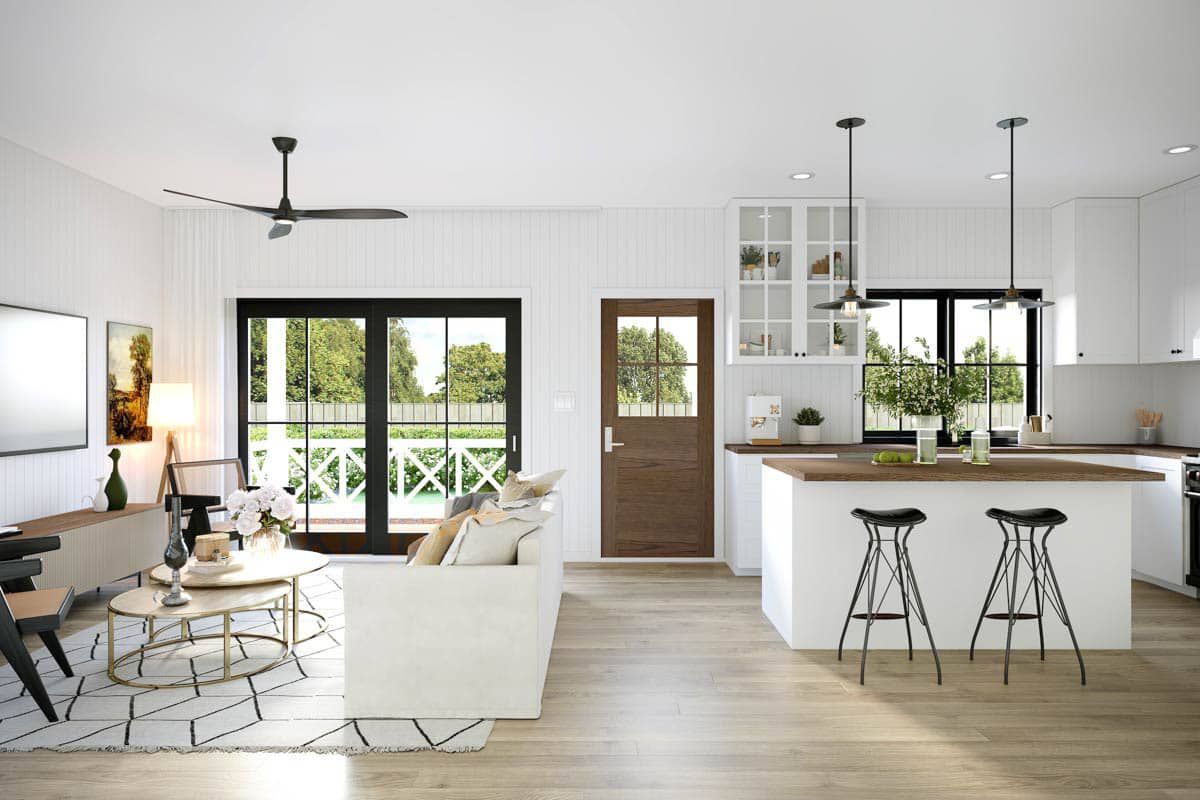 The design features an **open concept** layout in the main living area: the kitchen sits on the left side (with a double sink under windows), and the living room on the right.