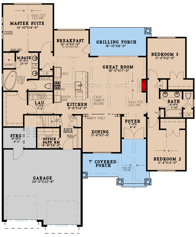The master bedroom is positioned for privacy, while the secondary bedrooms are grouped on the opposite side of the house.