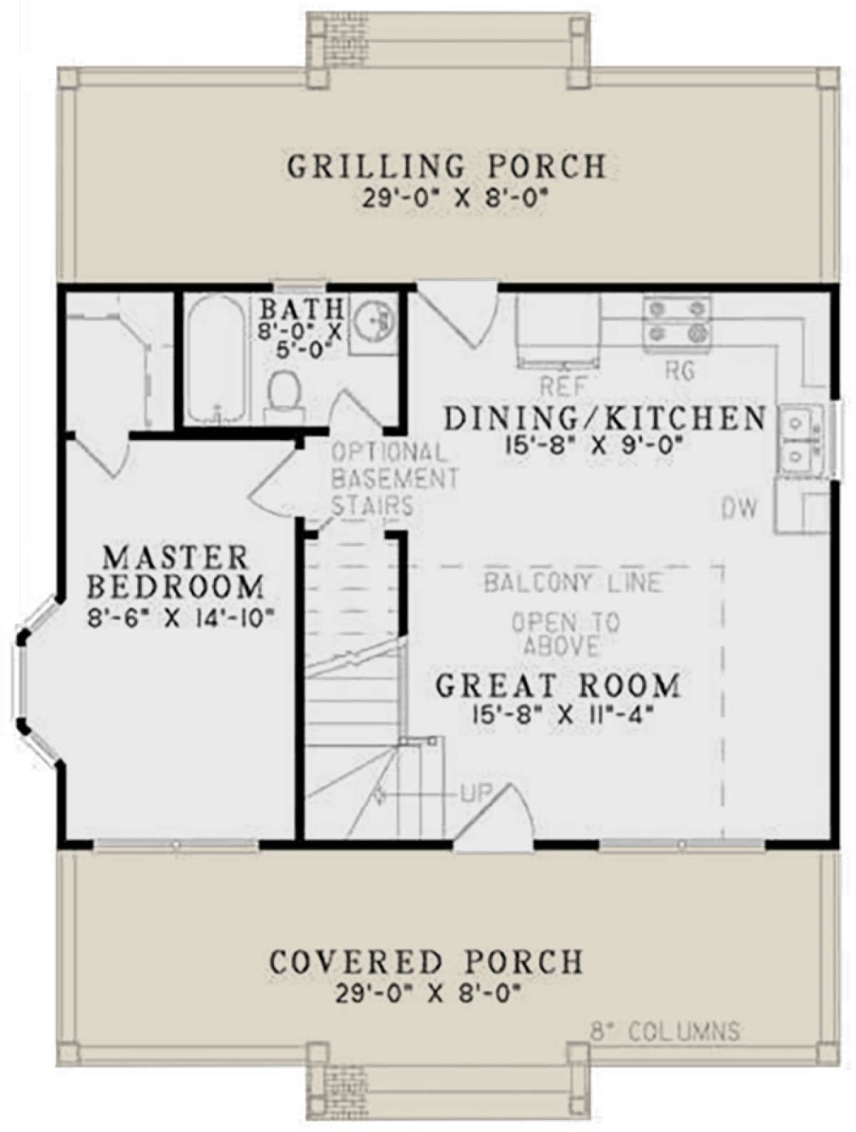 The **front covered porch** measures roughly 29 ft × 8 ft, giving a comfortable sheltered outdoor zone.