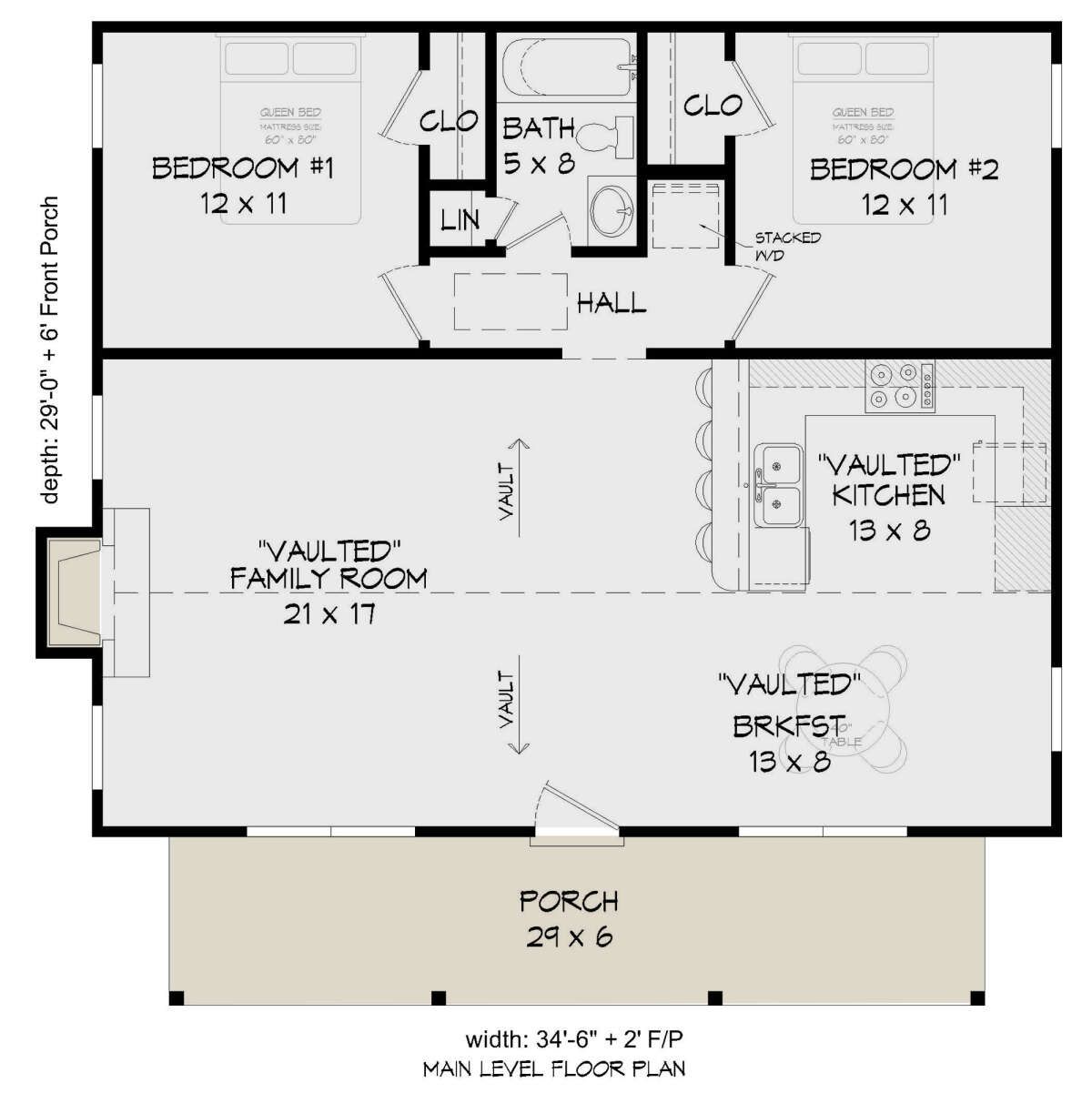 Its footprint spans **34 ft 6 in wide × 29 ft deep**, giving it a compact, rectangular profile.