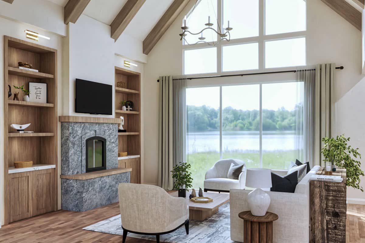The great room’s vaulted ceiling and fireplace create a dramatic centerpiece.