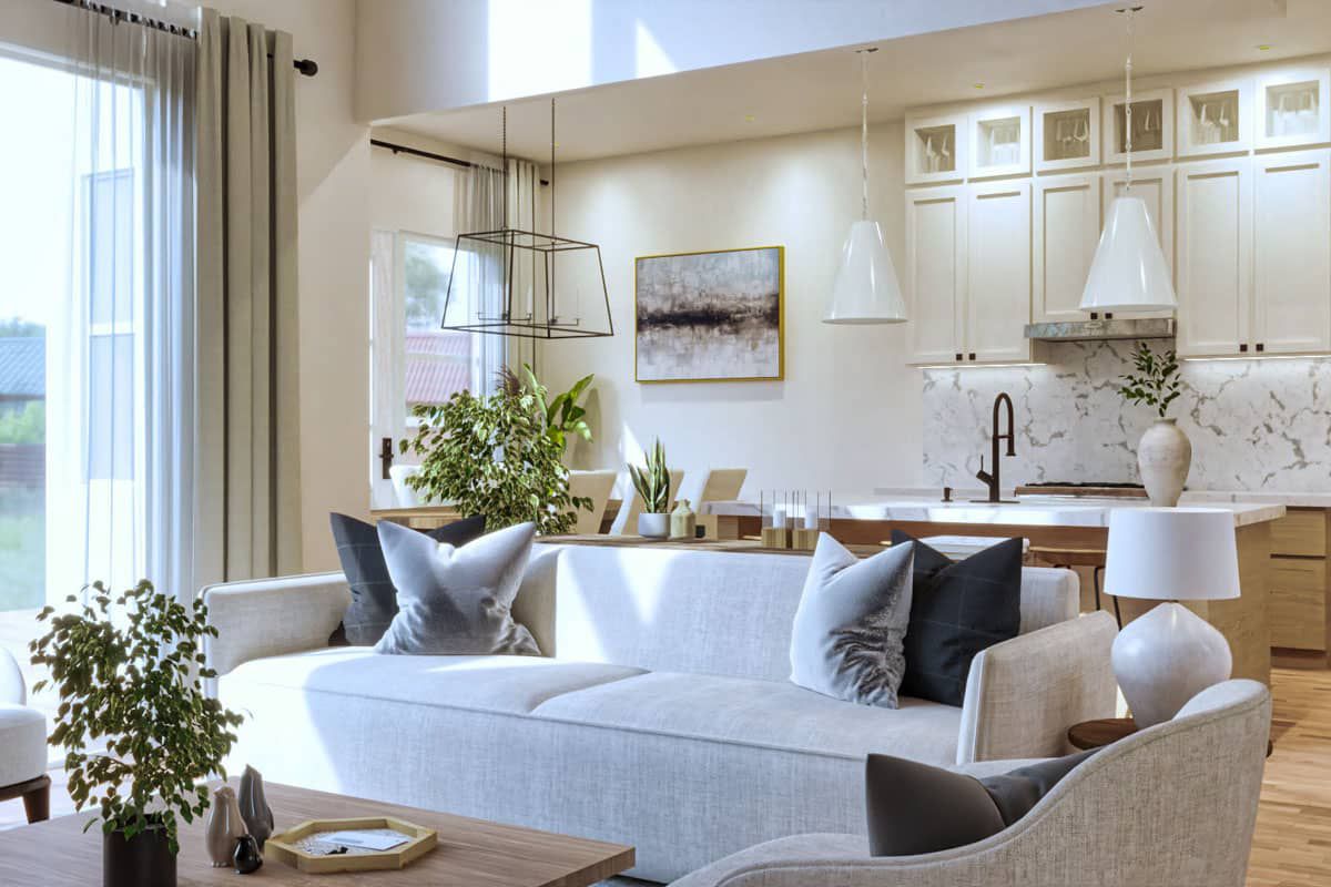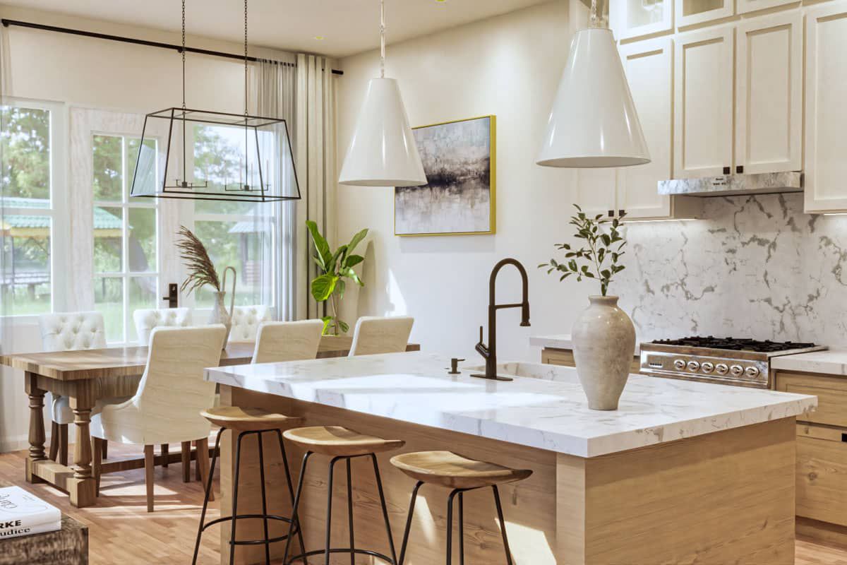 The kitchen is thoughtfully positioned within the open core, adjacent to both dining and living zones.