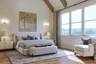 The master bath features dual vanities, a private toilet, and a bath layout that complements the vaulted ceiling and closet flow.
