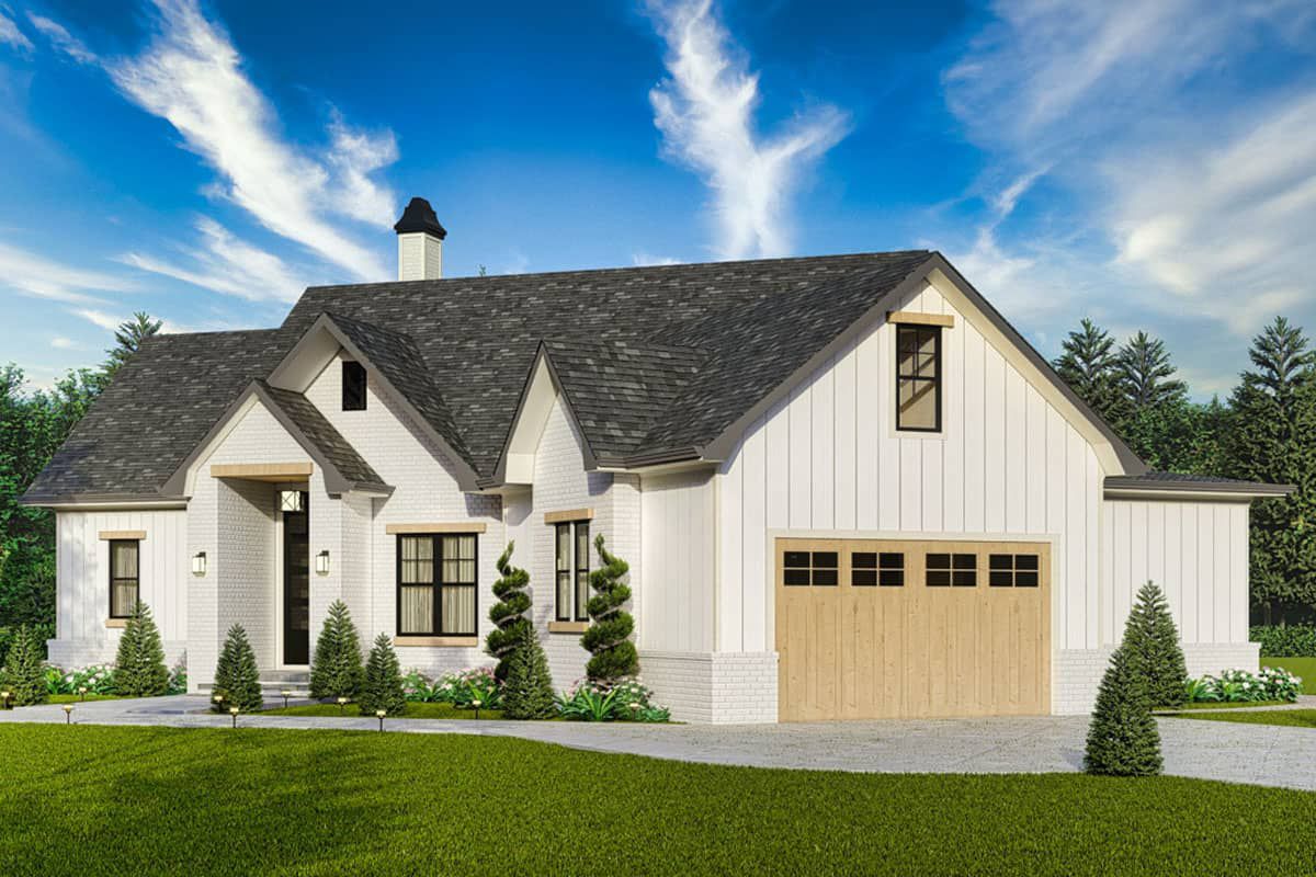 The angled garage (≈ 558 sq ft) is designed for two cars with a side entry, minimizing street-front impact.